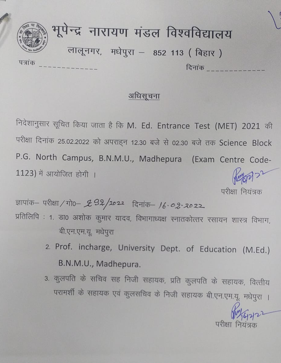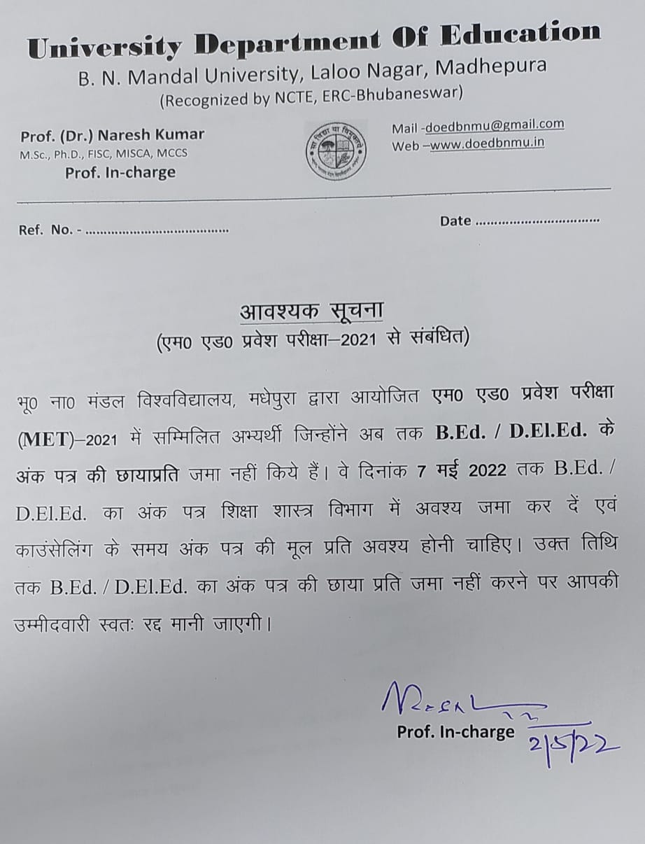 Last date for admission in M.Ed. Iˢᵗ Semester (2020-2022) has been extended till 10ᵗʰ June, 2021.