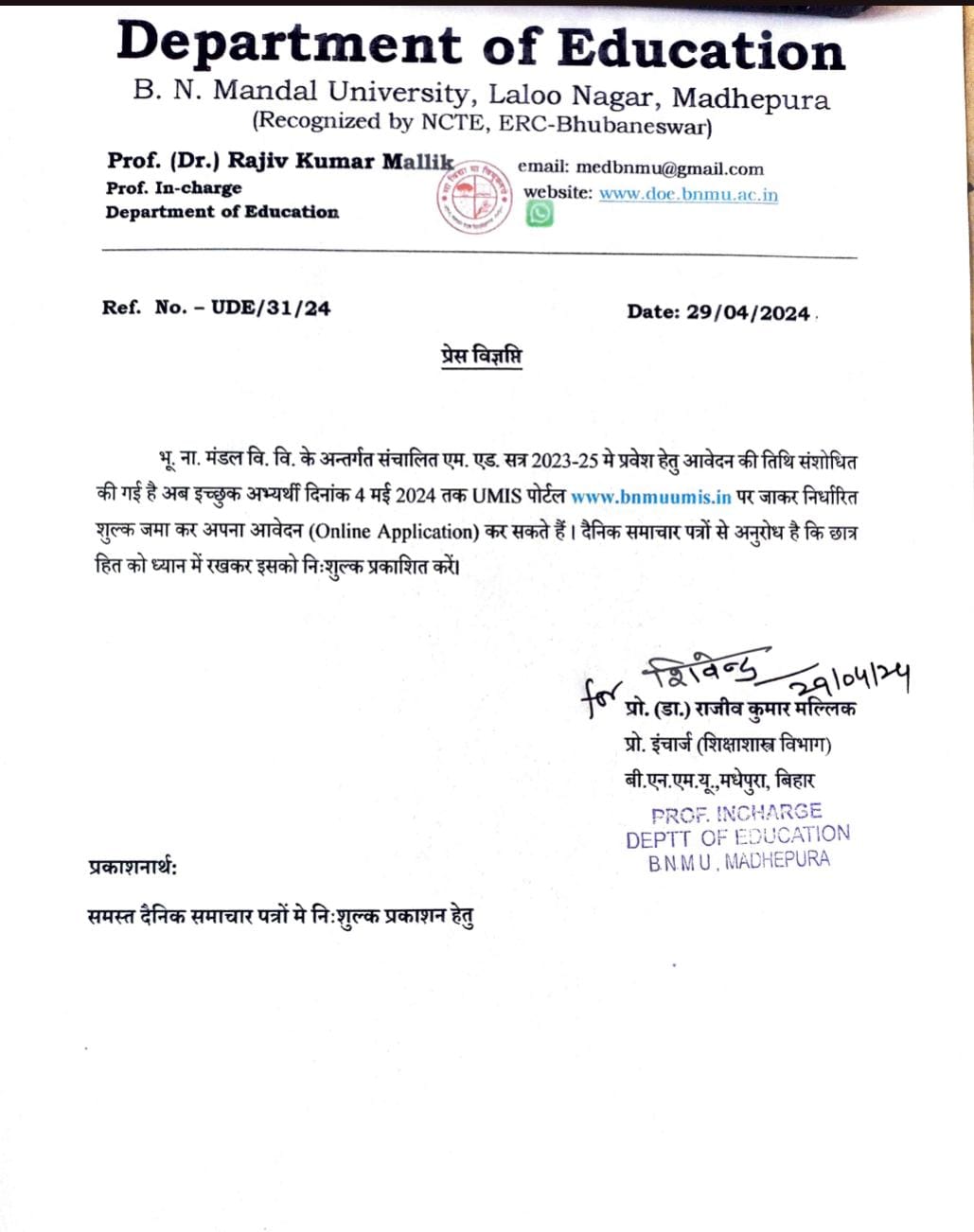 M.Ed. (Iˢᵗ Semester) Admission extended till 10ᵗʰ June, 2021
